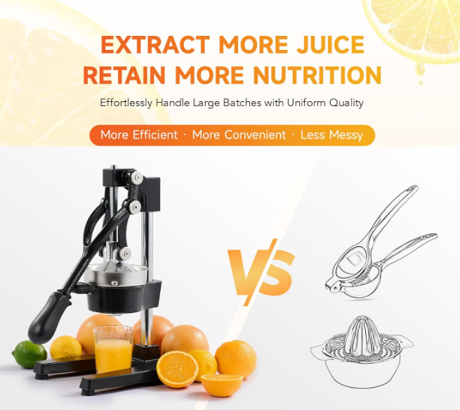 The long, gravity-assisted lever multiplies your hand force so juice flows with minimal effort. The cast-iron frame stays rock-steady while the drip spout guides a clean, direct-to-glass pour.